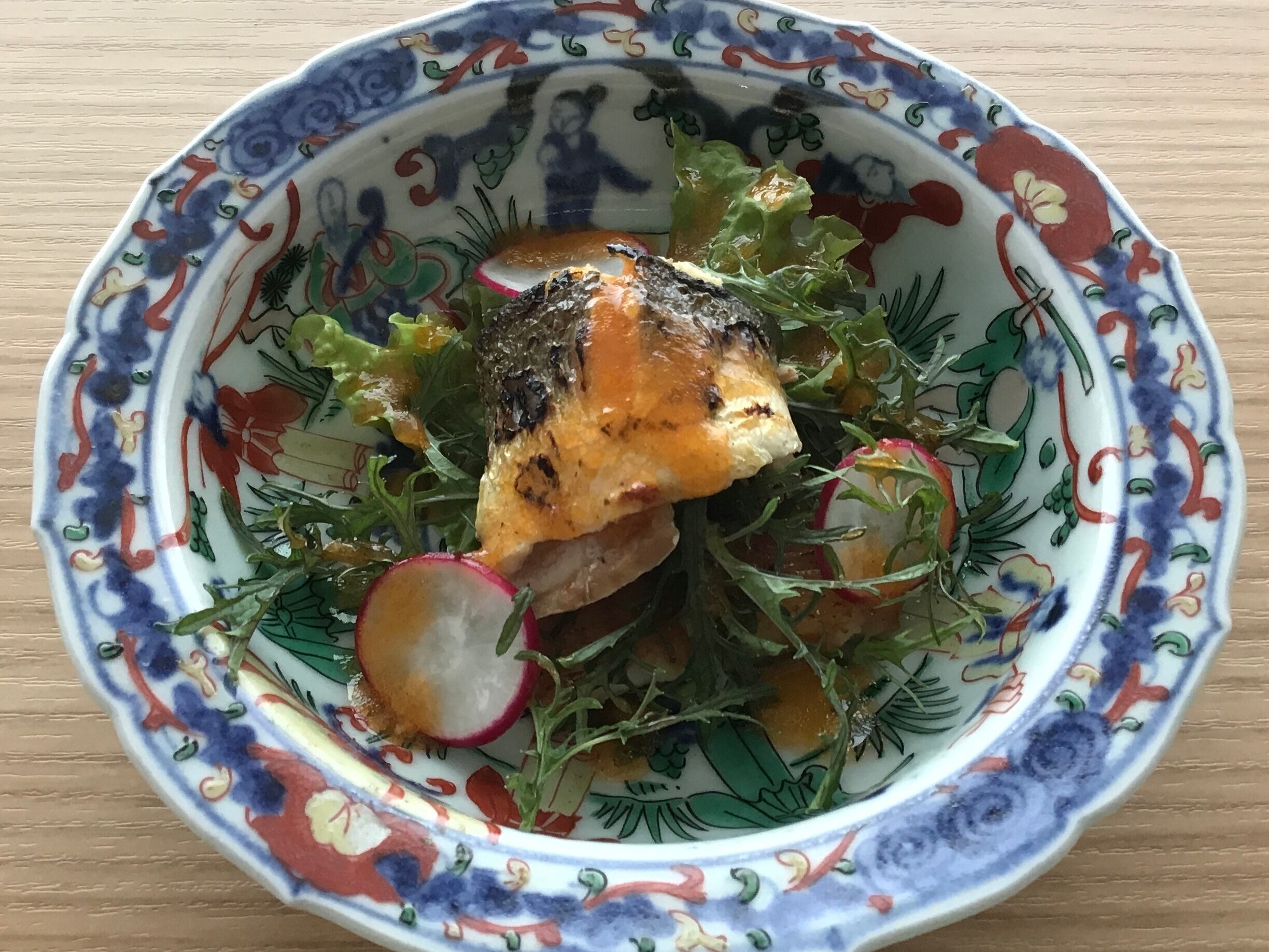 写真は、「豚肩ロースのソテーと夏野菜」「トビウオの塩焼きサラダ仕立て」「サラダ」